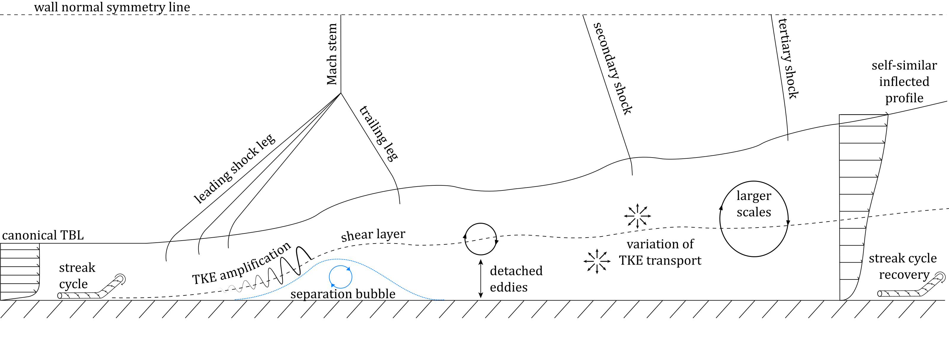 Wall resolved large eddy simulations of a spanwise homogeneous shock train are conducted, with the aim of quantifying how repeated interactions between the boundary layer and outer shock waves modify local turbulent processes. A description of the uncovered mechanisms is presented in the figure below, and a video overview of the project can be found on Youtube.